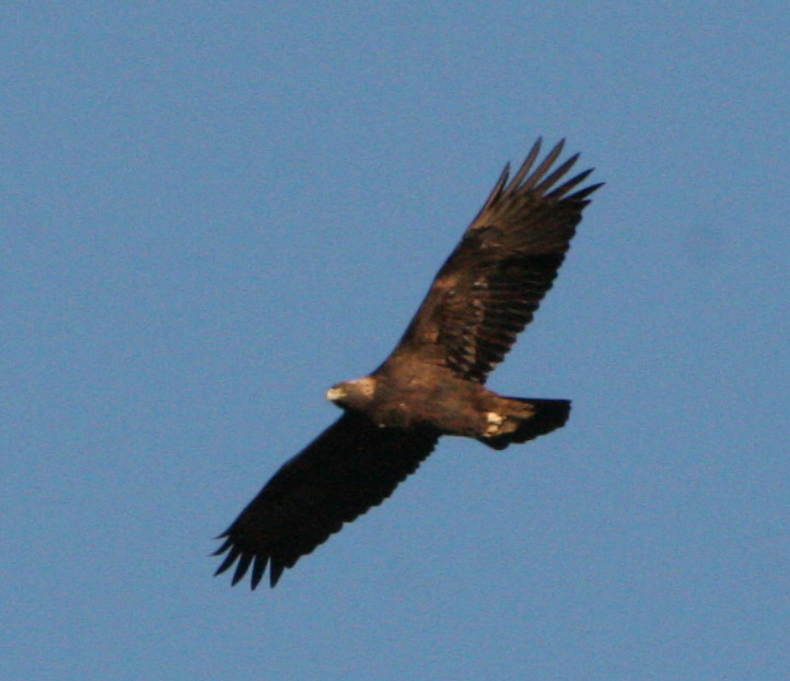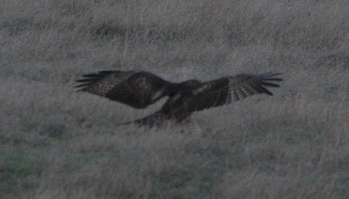 Continuing on from Highway 4, I looped through Markleeville (very disappointing - will return when it is covered in snow to see if it looks better) before heading back to the Bay Area over Highway 88. Was surprised to see the "Snow Chains Required" signs just as I passed Kirkwood Ski Area - but as you see the road did become snow covered. CHP was not in evidence checking chains though, and I saw many 2 wheel drive cars charging through. Just prior to Kirkwood, I did spot a Bald Eagle circling over a lake. Unfortunately it never came closer than a couple of hundred yards, so I was unable to get a good photo. Continued on down to the valley heading home. Traffic on I580 in the Bay Area was heavy, so decided to cut through Altamont Pass. My timing was good - I spotted a couple of burrowing owls (too far away for good photo's) and then the Red Tailed Hawk (below left) on the ground. Shortly afterward, a Golden Eagle circled above the hill allowing me to take another reasonable photo (below right). Not a bad day at all for wildlife.....