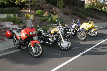 They are (left to right) Tiger - Triumph Tiger. Great to ride, best for long distance riding (but see "Story of Tiger" below). Speedmaster - Triumph Speedmaster. The lip curling cruiser. Too noisy says my wife. See UPDATE below. Bonnie - Triumph Bonneville. My first motorbike (but in 2003!). Great fun to ride and attracts a lot of attention. Sprint - Triumph Sprint RS. Fast, light, great fun. Probably the most fun to ride. UPDATE: November 2007. Speedmaster has left the stable, and returned to her original owner! I bought her when he moved overseas, but now returning (either to England or the US) he has bought her back. I know she has returned to a loving home...... The Story of "Tiger" Tiger was bought in Los Angeles (actually in Brea). She was purchased over the phone, and I took a flight down to LA to pick her up. A good friend drove me from LAX Airport to Brea, where I picked up the bike. Now to ride home....only 380 miles. Problem was, it was mid July. Having seen the weather forecast, I knew I was going to roast. I had bought some summer riding gear (aerated jacket and pants, perforated gloves and a drip vest) but even so, the quickest route back was going to be the best. That meant Interstate-5 over the Grapevine and up the Central Valley. The table below shows times and temperatures....as you see, HOT wasn't the word!
